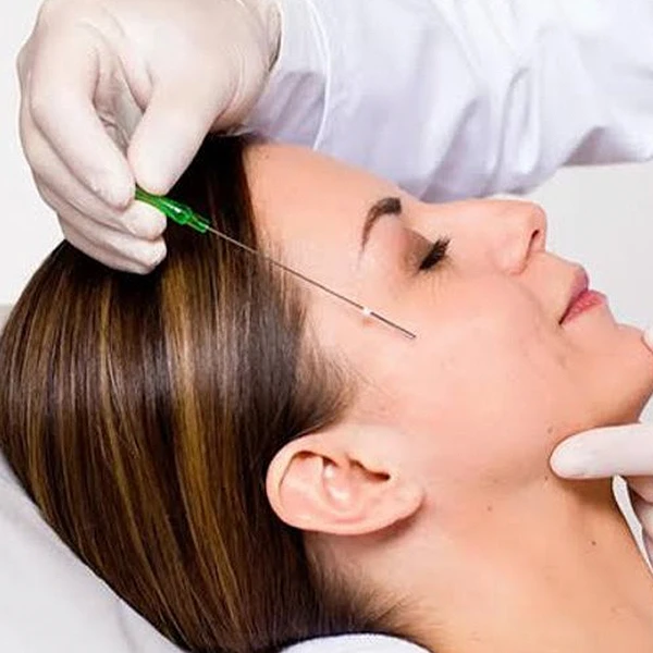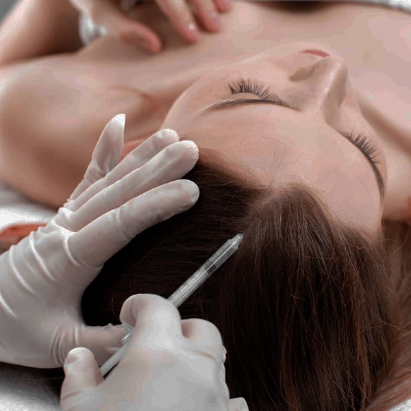 Aplicação de técnicas para tratamento de condições capilares, como queda e afinamento dos fios.