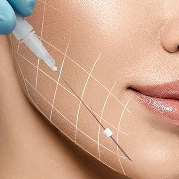 Procedimento de inserção de fios lisos para proporcionar suporte e definição facial.